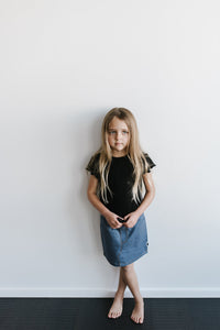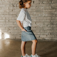 North Kinder's denim skirt has an elastic waistband and a fake button front detail, allowing this garment to be easy for your toddler to put on. With an oversized back pocket and straight cut look, your girl can definitely match her mama. Pair it with the ribbie tee or knotted tee to complete the look! Our denim items are stitched with true denim thread.