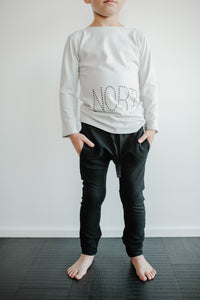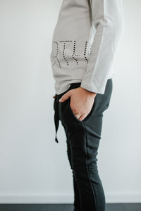 These fun little joggers have a soft fabric waistband and faux cotton drawstring. They are so comfy, your little one will want to stay in them forever. (Fear not, when they outgrow them, we have kid sizes too!) Kid sizes 3/4T and 5/6Y have an elastic waistband, real drawcord and pockets! Pair with the long sleeve shirt to complete the look.