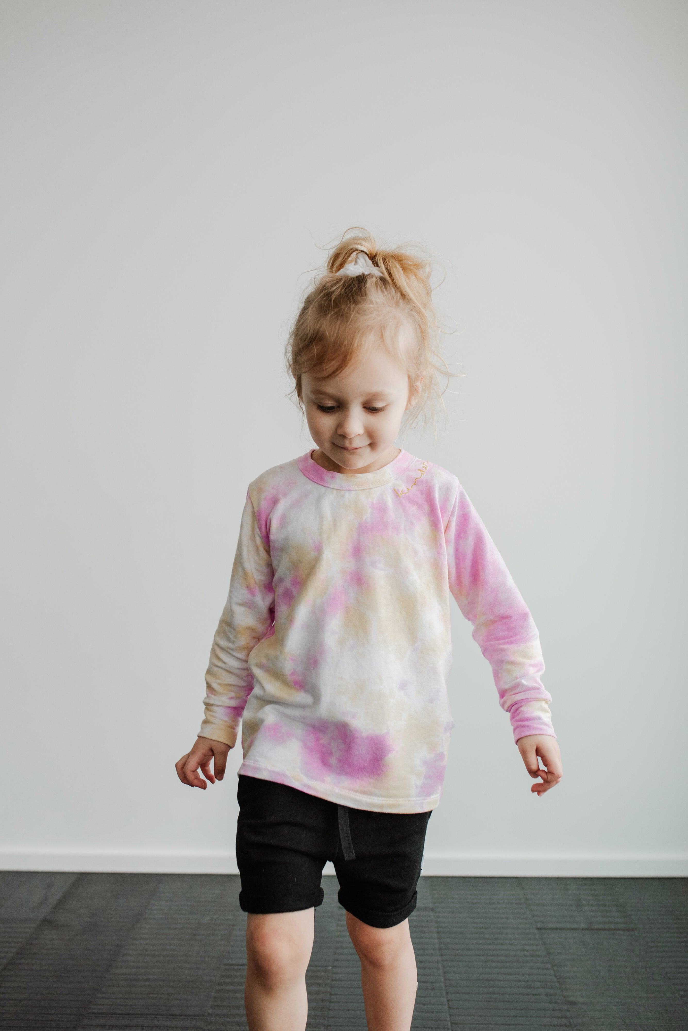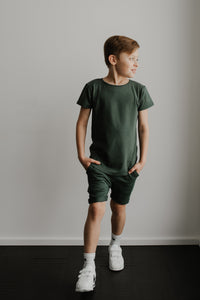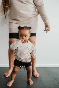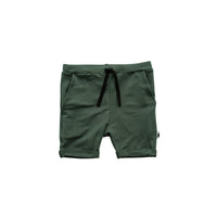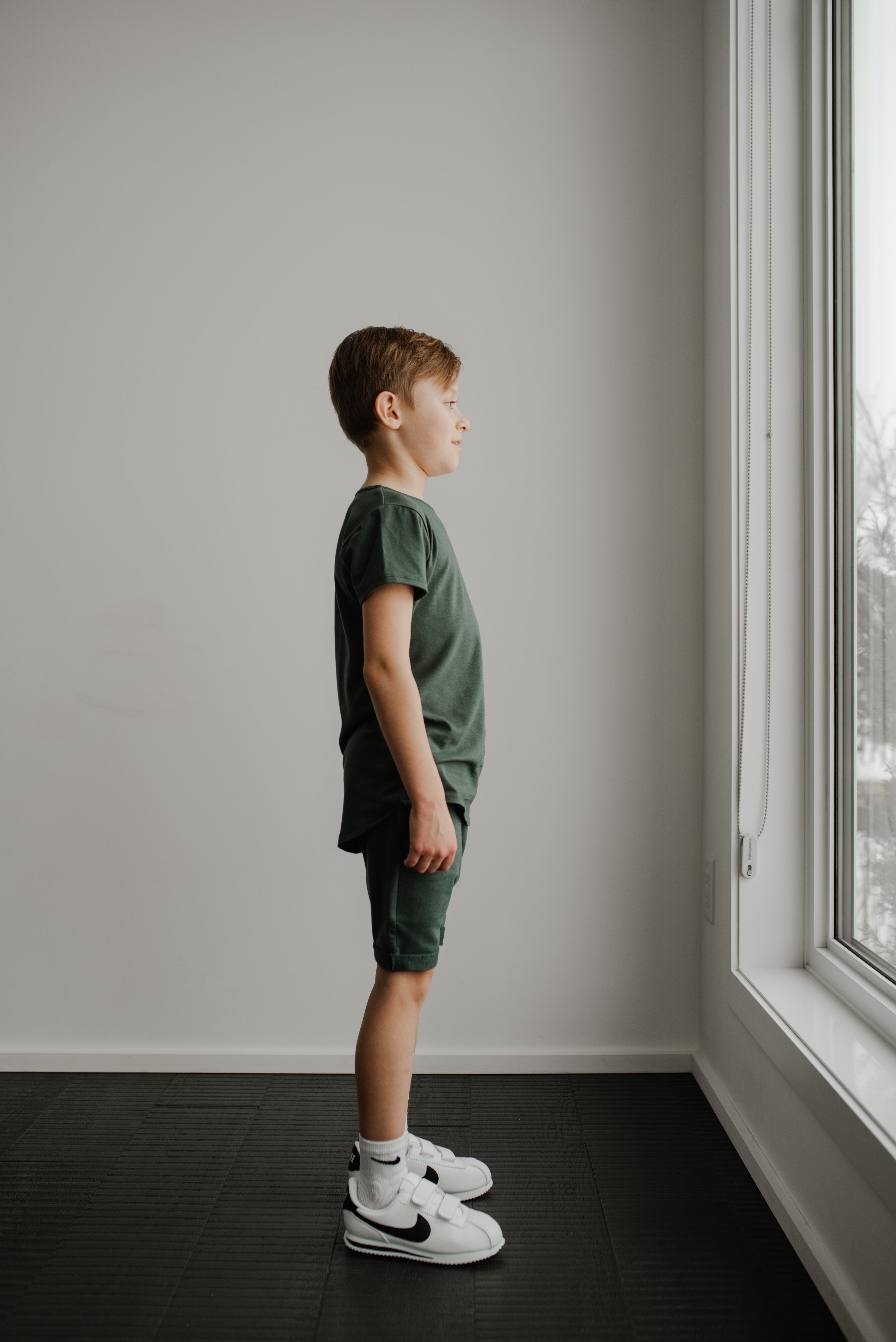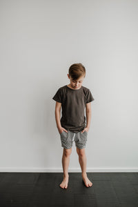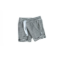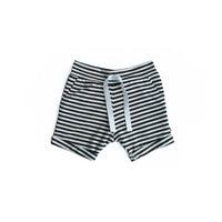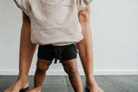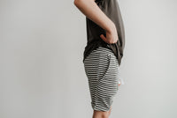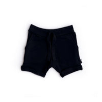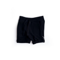 The play shorts are an everyday staple for warm weather days! Our modern design features a relaxed fit, rolled bottom cuff, and pockets. The baby sizes have a soft waistband and faux drawcord, while the kid sizes have an elastic waistband and real drawcord. This is the perfect basic short to add to your child’s wardrobe! Match these bottoms with the kinder tee, speed tank, baby sweater, and every other top!