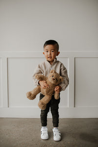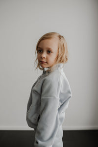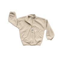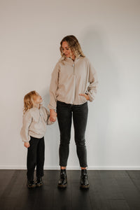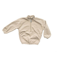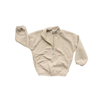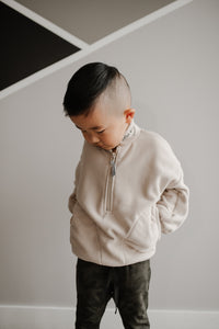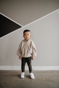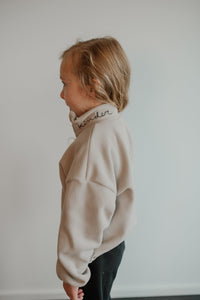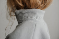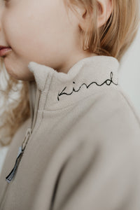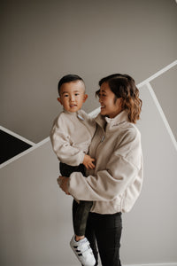 How can a sweater this soft be made from recycled plastic water bottles! The polar fleece half zip pullover features a “baby” or “kinder” embroidery in custom stitch on the collar. It also has a NK tree logo pull tab, elastic sleeve and waist cuffs, and a cute elastic detail on the pockets. With an oversized warm and cozy fit, this piece feels like a hug from your favourite teddy bear!